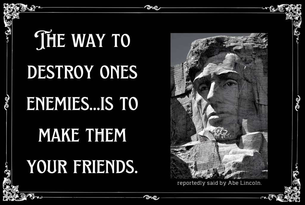 Much love to any of my enemies that will read this. But according to Abe Lincoln: “The way to destroy ones enemies…is to make them your friends”.