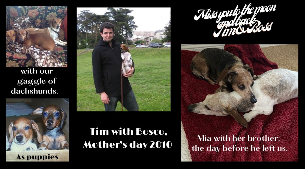 A quick story: When Bosco (our beloved pet dachshund) was leaving this earth he was lethargic the whole day. We decided to take him to the emergency vet to have him put down that evening. A few minutes before he died he started talking. I mean he was loud and animated like he had something to say. As I wrapped him in a blanket and carried him to the car we had the best conversation. We were talking about old times and how he’d see Tim soon.